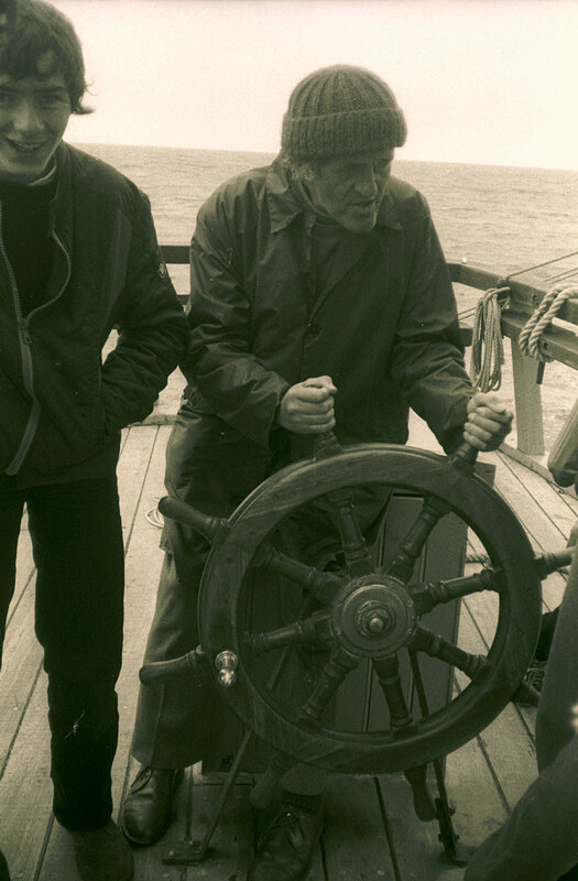 1980. Poet George Mackay Brown at the helm of the 'Marques' sailing ship. Edinburgh Arts 1980 sea-voyage on the 'Marques'.