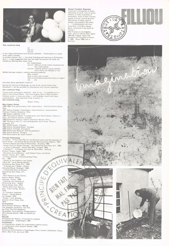 23 August - 12 September 1970. Exhibition catalogue. Page 15 of 42. Strategy: Get Arts (contemporary art from Dusseldorf, Germany) presented by the RDG in association with Kunsthalle Dusseldorf, at Edinburgh College of Art, for the Edinburgh International Festival 1970. Robert Filliou