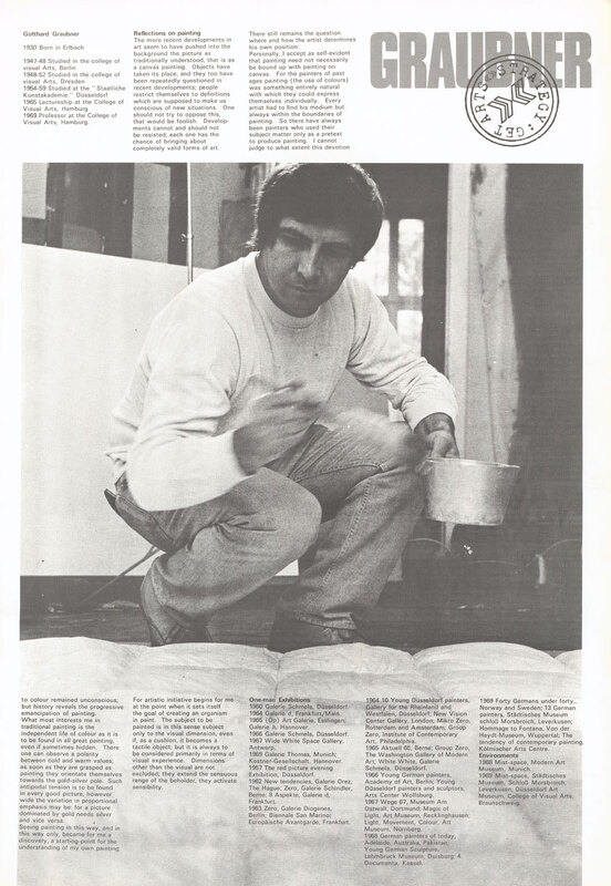 23 August - 12 September 1970. Exhibition catalogue. Page 17 of 42. Strategy: Get Arts (contemporary art from Dusseldorf, Germany) presented by the RDG in association with Kunsthalle Dusseldorf, at Edinburgh College of Art, for the Edinburgh International Festival 1970. Gotthard Graubner.