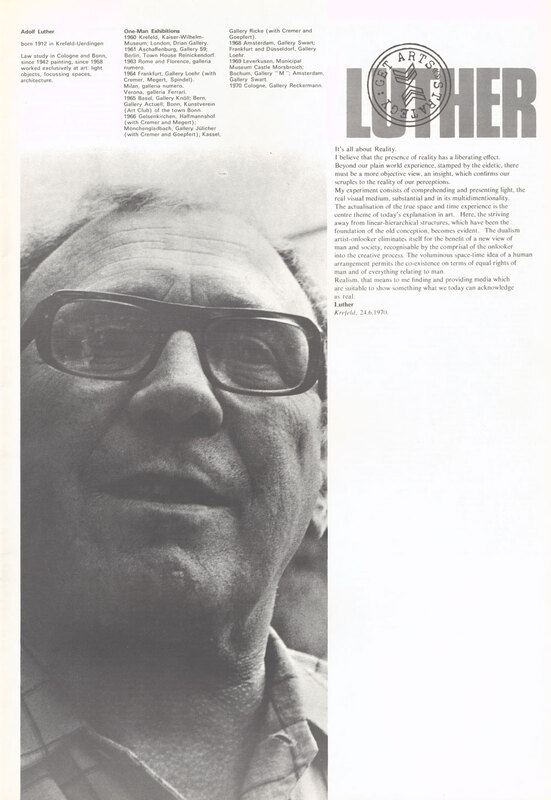23 August - 12 September 1970. Exhibition catalogue. Page 25 of 42. Strategy: Get Arts (contemporary art from Dusseldorf, Germany) presented by the RDG in association with Kunsthalle Dusseldorf, at Edinburgh College of Art, for the Edinburgh International Festival 1970. Adolf Luther.