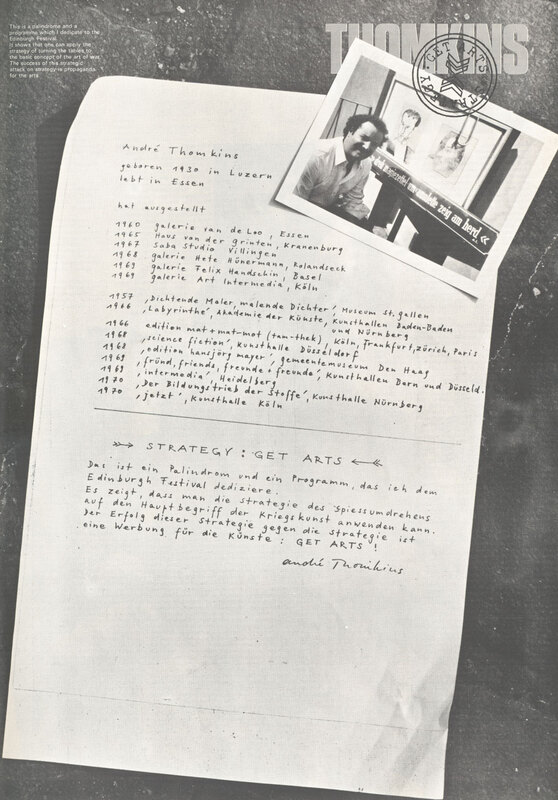 23 August - 12 September 1970. Exhibition catalogue. Page 37 of 42. Strategy: Get Arts (contemporary art from Dusseldorf, Germany) presented by the RDG in association with Kunsthalle Dusseldorf, at Edinburgh College of Art, for the Edinburgh International Festival 1970. Andre Thomkins.