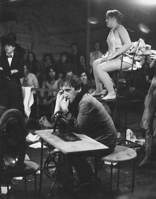 August/September 1972. Performance of The Water Hen by Taduesz Kantor's Cricot 2 Theatre company at Forrest Hill Poorhouse. Kantor seated centre, Maria Stangret-Kantor seated behind. Edinburgh Festival 1972.