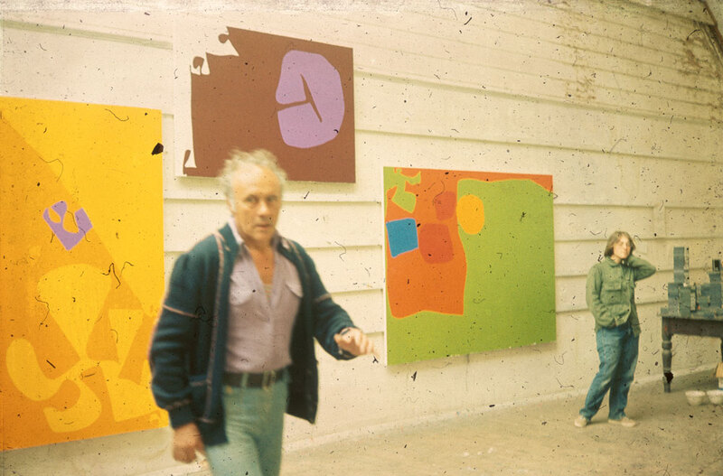9-12 July 1977. Patrick Heron (left) in his studio at Eagle's Nest, Zennor, Cornwall, during a visit by the Edinburgh Arts 1977 group.