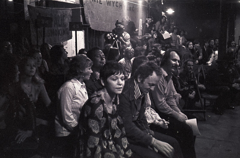 August/ September 1973. Tadeusz Kantor's Cricot 2 Theatre production of Lovelies and Dowdies at Forrest Hill Poorhouse, Edinburgh. Edinburgh Arts 1973. Audience, including Scottish artist Gerald Laing, front, centre.