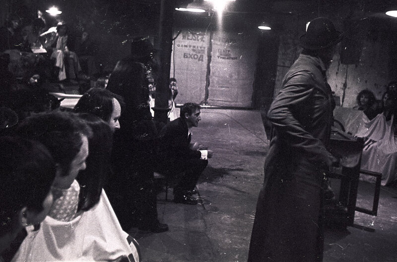 August/ September 1973. Tadeusz Kantor's Cricot 2 Theatre production of Lovelies and Dowdies at Forrest Hill Poorhouse, Edinburgh. Edinburgh Arts 1973. Kantor, centre. Scottish artist Gerald Laing in audience, second from left.