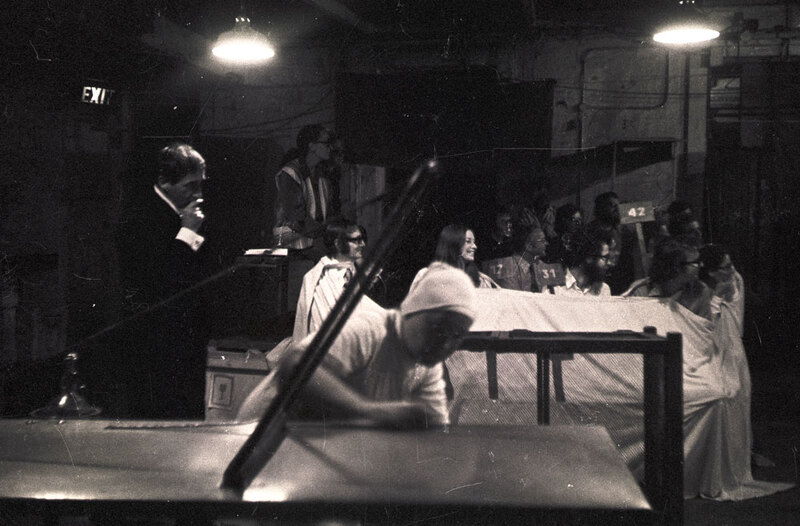 August/ September 1973. Tadeusz Kantor's Cricot 2 Theatre production of Lovelies and Dowdies at Forrest Hill Poorhouse, Edinburgh. Edinburgh Arts 1973. Kantor, right. Maria Stangret-Kantor, front.