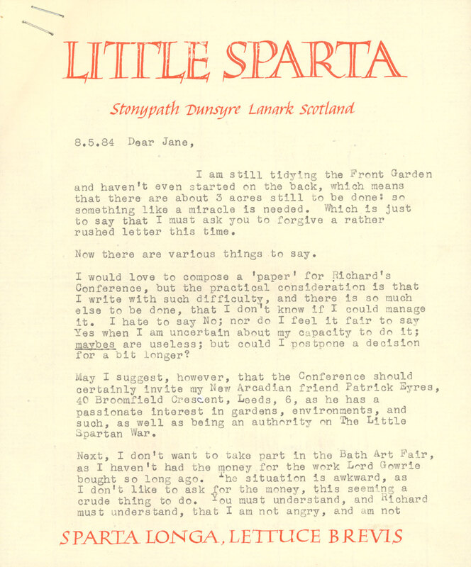 8 May 1984. Letter (page 2 of 3) from Ian Hamilton Finlay to Jane MacAllister, Depute Director of the RDG, with references including Finlay's proposed contribution to the RDG's forthcoming Art and the Human Environment conference (August 1984).