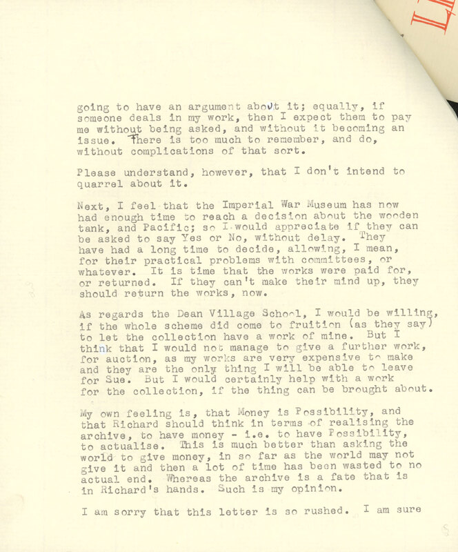 8 May 1984. Letter (page 2 of 3) from artist Ian Hamilton Finlay to Jane MacAllister, Depute Director of the RDG, with references including Finlay's proposed contribution to the RDG's forthcoming Art and the Human Environment conference (August 1984).