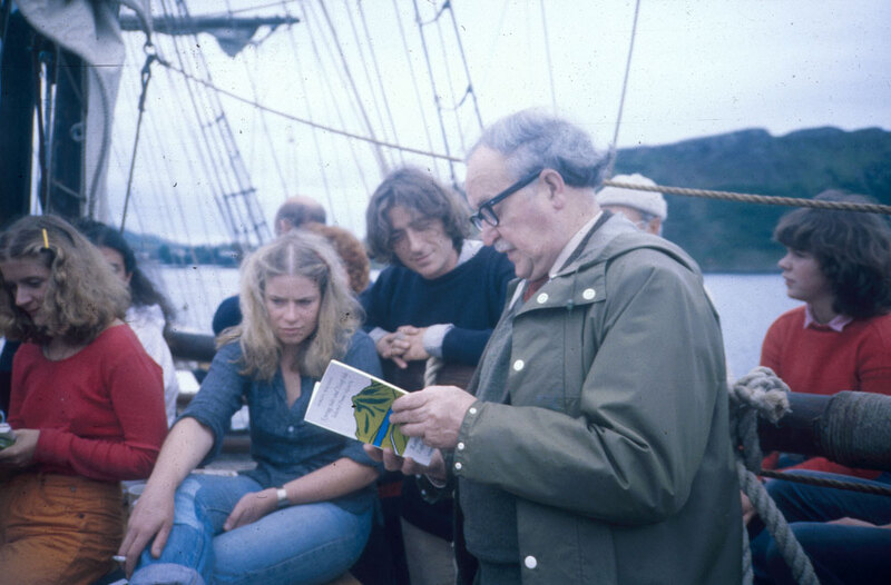 11 - 13 August 1980. Sorley MacLean reading his poetry on the 'Marques' sailing ship, sailing through the Sound of Raasay, of the Isle of Skye, Scotland, during the Edinburgh Arts 1980 sea-voyage on the 'Marques'.
