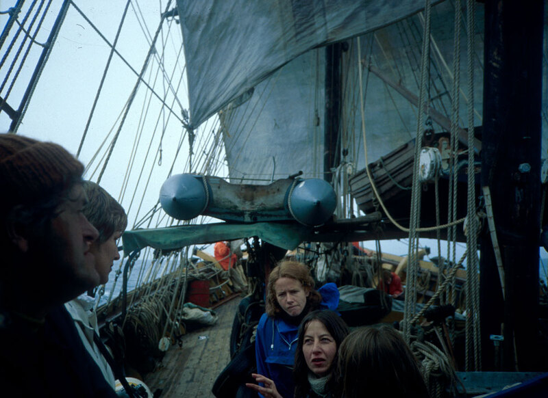 17 August 1980. Scottish poet George Mackay Brown (left) on the 'Marques' sailing ship, off the Orkney Islands, Scotland, during the Edinburgh Arts 1980 sea-voyage on the 'Marques'.