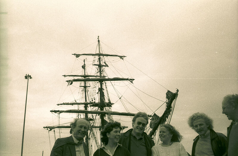 25 August - 6 September 1980. L-R: Johannes Cladders, unknown, Jurgen Harten, Jane MacAllister, Ulrich Krempel, with the 'Marques' sailing ship at anchor in Leith Docks, Edinburgh. Edinburgh Arts 1980 sea-voyage on the 'Marques'.