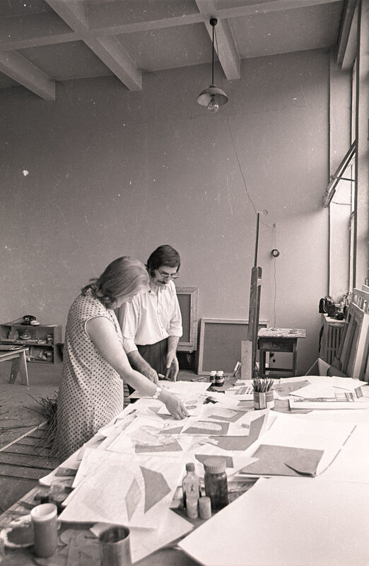Summer 1971. Scottish arts critic Cordelia Oliver and Romanian artist Pavel Ilie in Ilie's studio in Bucharest, Romania. Photographed by George Oliver during a visit in the summer of 1971 to gather material for the catalogue for the exhibition Romanian Art Today, shown at the RDG, 8 Melville Crescent, Edinburgh (23 August-11 September).