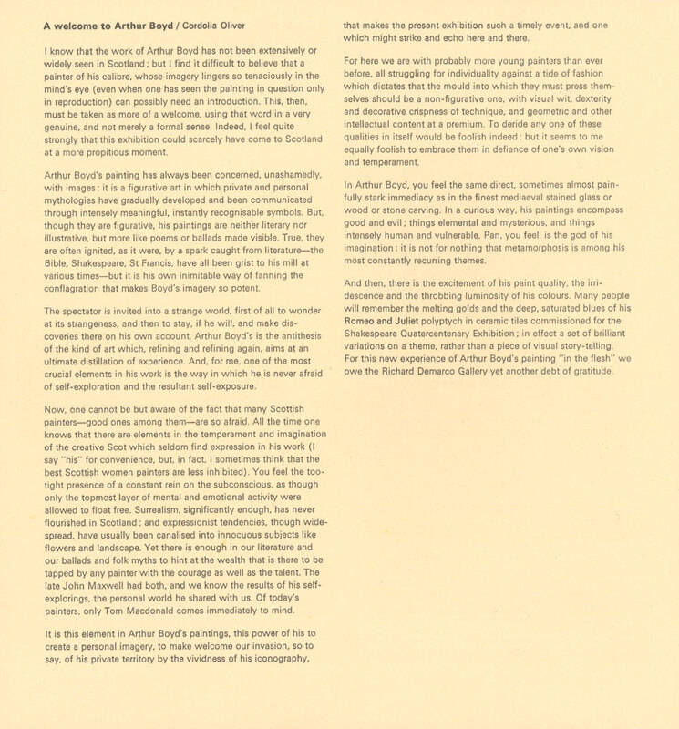 14 April - 10 May 1967. Exhibition catalogue. PageĀ 2 of 2. Arthur Boyd: Retrospective Exhibition of Paintings and other Work. Presented by the RDG at 8 Melville Crescent, Edinburgh. Introductory essay by Cordelia Oliver.