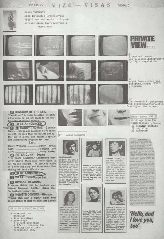 27 September - 25 October 1975. Exhibition catalogue. Page 18/45. Aspects 75 (Contemporary Yugoslavian Art) organised by RDG in association with the City Art Galleries, Zagreb, presented at the Scottish Arts Council's Fruit Market Gallery, Edinburgh, and RDG, Monteith House, Edinburgh. Sanja Ivekovic.
