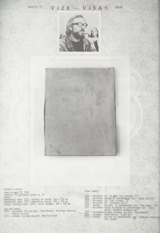 27 September - 25 October 1975. Exhibition catalogue. Page 43/45. Aspects 75 (Contemporary Yugoslavian Art) organised by RDG in association with the City Art Galleries, Zagreb, presented at the Scottish Arts Council's Fruit Market Gallery, Edinburgh, and RDG, Monteith House, Edinburgh. Gergely Urkom.