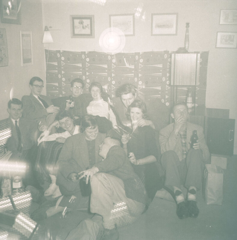 1964/1965. Group includes Anne Demarco (centre) and John Kelly (musician, on left with glasses). Demarcos' flat, 29 Frederick Street, Edinburgh. Heal's curtain material on screen behind.