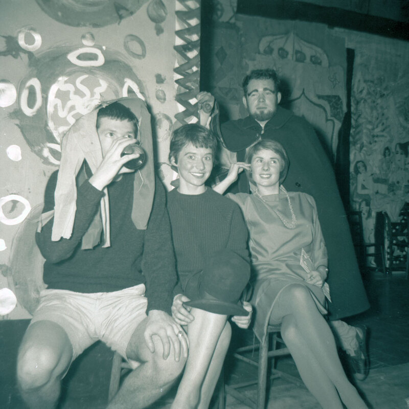 Date? Jim Haynes, unidentified, Anne Demarco, George Sutherland. Student party?