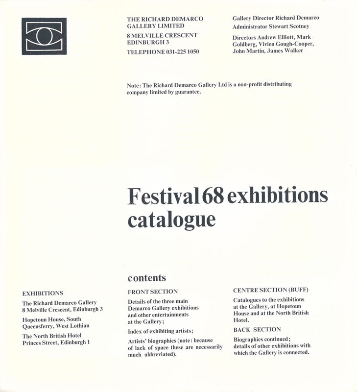 August/ September 1968. Exhibitions catalogue. Page 1 of 8. RDG Festival '68 exhibitions and events, including 53 Contemporary Painters at the RDG, 8 Melville Crescent, Edinburgh; Open Air Sculpture at Hopetoun House, South Queensferry; 14 Contemporary Painters at North British Hotel, Edinburgh; Canada 101 at Edinburgh College of Art; Denise Rene in Edinburgh, and works by Amicam Toren and Menashe Kadishman at Goldbergs, Edinburgh.