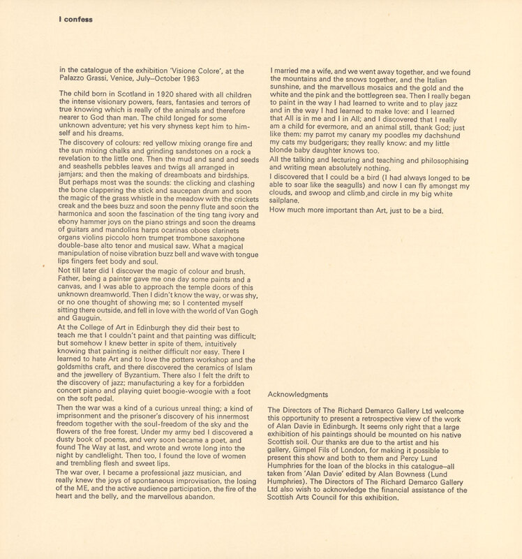 3 - 29 June 1968. Exhibition catalogue. PageĀ 2 of 2. Alan Davie retrospective exhibition of 52 paintings at the RDG, 8 Melville Crescent, Edinburgh. Text by Alan Davie.