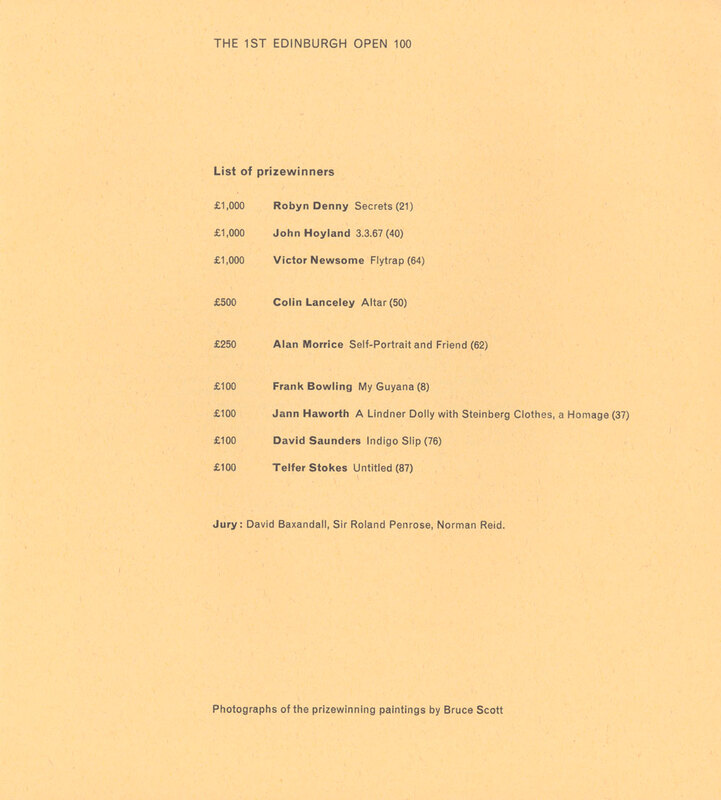 25 August - 25 September 1967. Exhibition Catalogue. PageĀ 2 of 7. Ist Edinburgh Open 100 presented by the RDG in association with University of Edinburgh, Edinburgh Festival Society, Scottish Arts Council, at David Hume Tower, University of Edinburgh. Exhibition of 100 best competition entries chosen by David Baxandall, Norman Reid, Sir Roland Penrose. Main prizewinners Robyn Denny, John Hoyland, Victor Newsome.