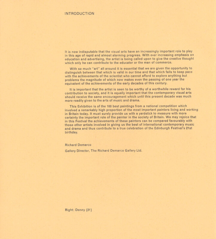 25 August - 25 September 1967. Exhibition Catalogue. PageĀ 3 of 7. Ist Edinburgh Open 100 presented by the RDG in association with University of Edinburgh, Edinburgh Festival Society, Scottish Arts Council, at David Hume Tower, University of Edinburgh. Exhibition of 100 best competition entries chosen by David Baxandall, Norman Reid, Sir Roland Penrose. Main prizewinners Robyn Denny, John Hoyland, Victor Newsome.
