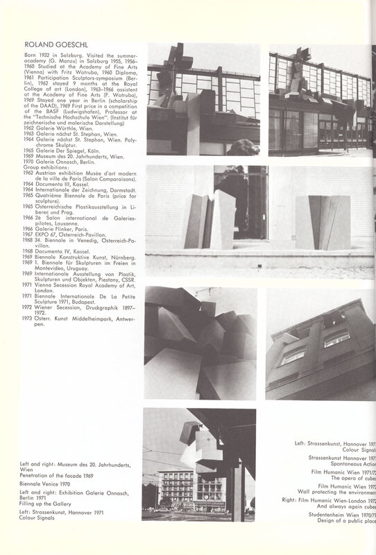 19 August - 30 September 1973. Exhibition catalogue. Page 10 of 25. Roland Goeschl. The Austrian Exhibition. RDG, Edinburgh (19 August - 9 September 1973), and Institute of Contemporary Arts, London (12 - 30 September 1973). 23 Austrian artists: Gottfried Bechtold, Gunter Brus, Anton Christian, Heinz Gappmayr, Bruno Gironcoli, Roland Goeschl, Hans Hollein, Richard Kriesche, Robert Lettner, Herman Nitsch, Oswald Oberhuber, Max Peintner, Walter Pichler, Karl Prantl, Arnulf Rainer, Mario Terzic, Turi Werkner; films by Marc Adrian, Valie Export, Kurt Kren, Peter Kubelka, Ernst Schmidt Jr, Peter Weibel.