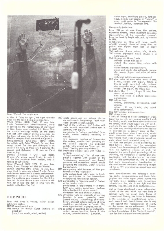 19 August - 30 September 1973. Exhibition catalogue. Page 17 of 25. Films. The Austrian Exhibition. RDG, Edinburgh (19 August - 9 September 1973), and Institute of Contemporary Arts, London (12 - 30 September 1973). 23 Austrian artists: Gottfried Bechtold, Gunter Brus, Anton Christian, Heinz Gappmayr, Bruno Gironcoli, Roland Goeschl, Hans Hollein, Richard Kriesche, Robert Lettner, Herman Nitsch, Oswald Oberhuber, Max Peintner, Walter Pichler, Karl Prantl, Arnulf Rainer, Mario Terzic, Turi Werkner; films by Marc Adrian, Valie Export, Kurt Kren, Peter Kubelka, Ernst Schmidt Jr, Peter Weibel.