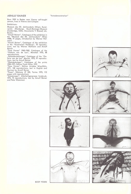 19 August - 30 September 1973. Exhibition catalogue. Page 23 of 25. Arnulf Rainer. The Austrian Exhibition. RDG, Edinburgh (19 August - 9 September 1973), and Institute of Contemporary Arts, London (12 - 30 September 1973). 23 Austrian artists: Gottfried Bechtold, Gunter Brus, Anton Christian, Heinz Gappmayr, Bruno Gironcoli, Roland Goeschl, Hans Hollein, Richard Kriesche, Robert Lettner, Herman Nitsch, Oswald Oberhuber, Max Peintner, Walter Pichler, Karl Prantl, Arnulf Rainer, Mario Terzic, Turi Werkner; films by Marc Adrian, Valie Export, Kurt Kren, Peter Kubelka, Ernst Schmidt Jr, Peter Weibel.