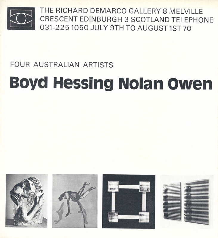 9 July - 1 August 1970. Exhibition catalogue (cover). Four Australian Artists: Arthur Boyd, Leonard Hessing, Sidney Nolan, Robert Owen. Presented by the RDG, 8 Melville Crescent, Edinburgh.