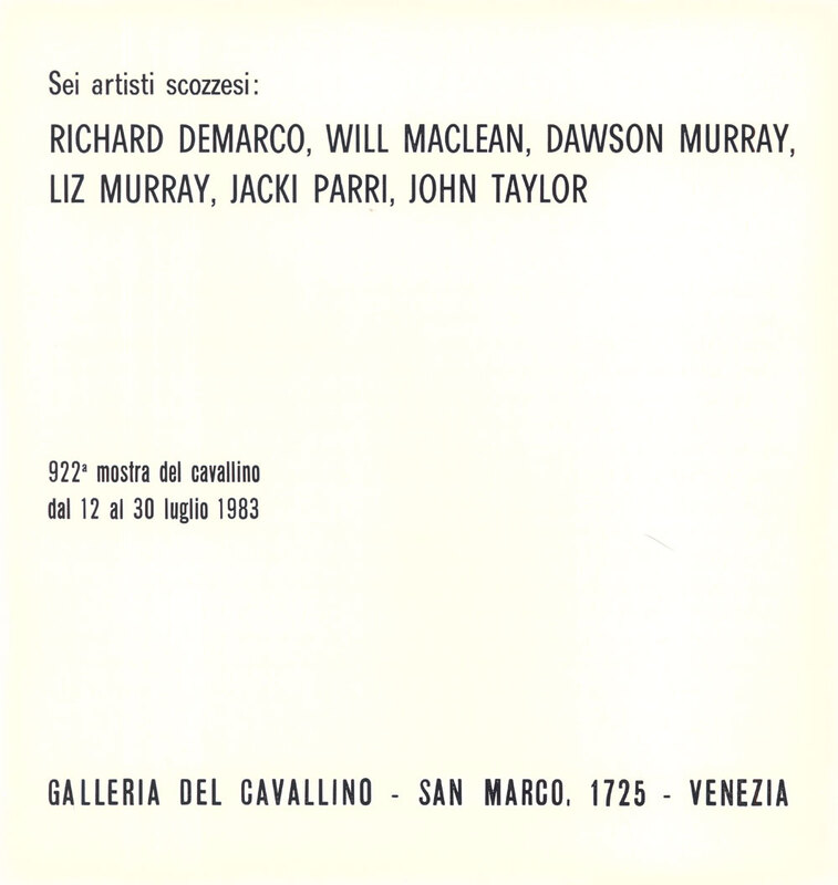 12 - 30 July 1983. Exhibition catalogue (cover). Sei Artisti Scozzesi (Six Scottish Artists): Richard Demarco, Will Maclean, Dawson Murray, Liz Murray, Jacki Parry, John Taylor, exhibition at Galleria del Cavallino, Venice, Italy.